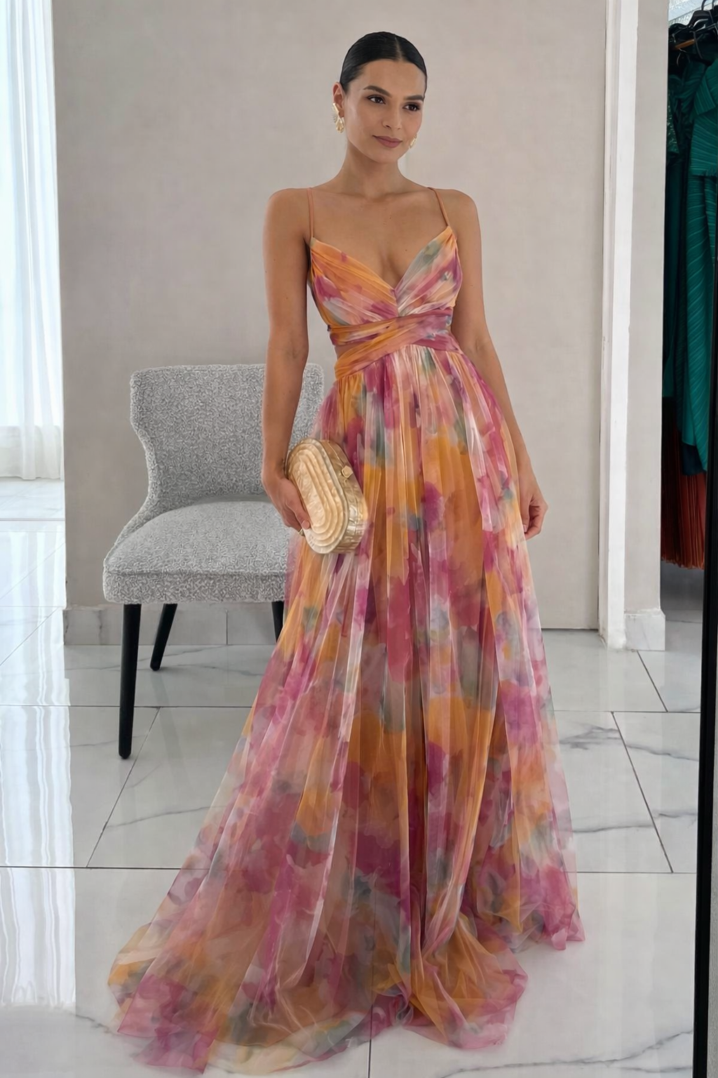 Gefertigt aus leichtem, atmungsaktivem Chiffon mit integriertem Innenfutter, umspielt Giselle die Figur mit natürlicher Eleganz. Der florale Print sorgt für einen romantischen Touch, während die verstellbare Passform es perfekt für jeden Anlass macht – von Tagen in der Stadt bis hin zu besonderen Abenden.